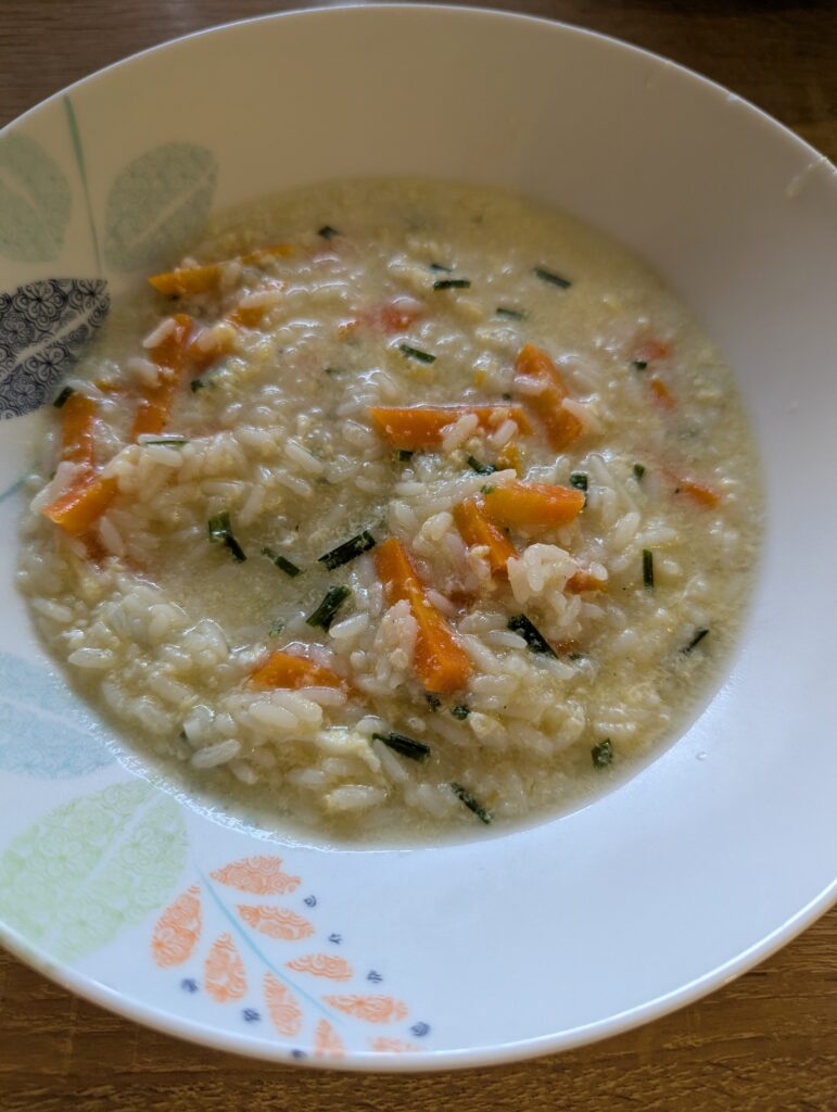 Die Butter in einem Topf zerlassen, den Reis zugeben und kurz glasig werden lassen. Gewürfelte Möhren unterrühren, mit dem Wasser aufgießen und etwas von der Gemüsebrühe zugeben. Die Suppe aufkochen lassen und alles ca. 15 Minuten garen. Evtl. mit Salz und Pfeffer abschmecken.